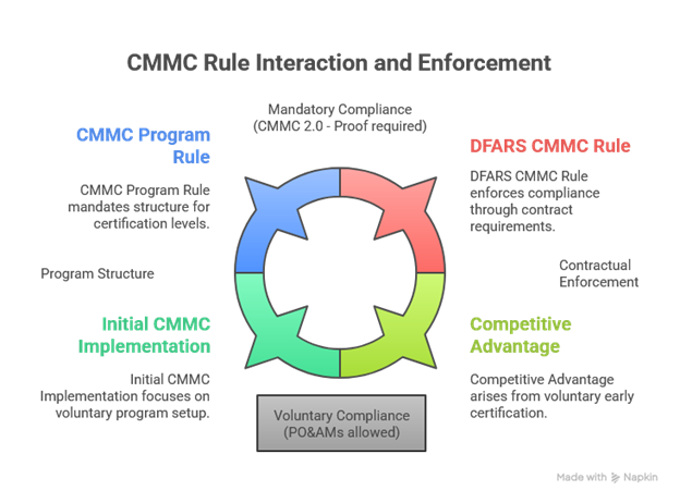 Compliance extends beyond IT. Human resources, procurement, facilities, legal oversight, and executive governance all contribute to assessment outcomes. Organizations that fail to coordinate across these functions risk assessment findings even when technical controls are present. CMMC derives its authority from the interaction of the Program Rule and the DFARS Rule. Together, they transform cybersecurity from a planning objective into an enforceable contractual condition. Eligibility is determined at the time of award, not after remediation.